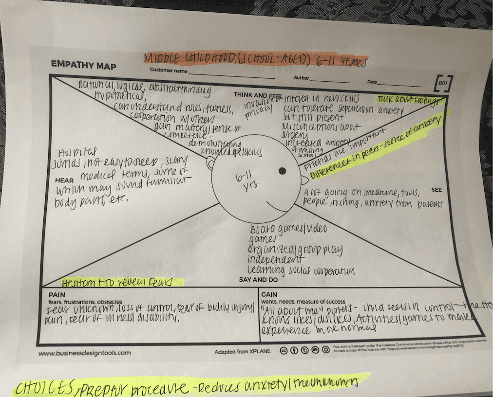 Considering the vast age range among pediatric patients, I investigated behavioral and developmental milestones relevant to different age groups through parent interviews and research. These insights were translated into empathy maps, journey maps, and user scenarios and personas.