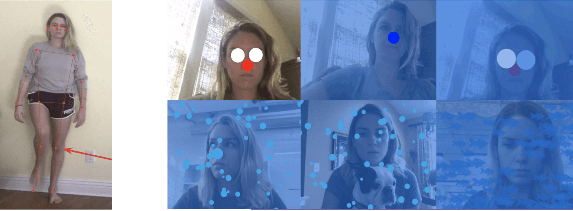 This creative coding library allowed me to design interactions with certain keypoints, such as using left and right wrist keypoints for popping bubbles and mapping the snorkel to the users' face using the eyes and nose keypoints. The iterative learning of this technology's capabilities and limitations was challenging but so exciting.