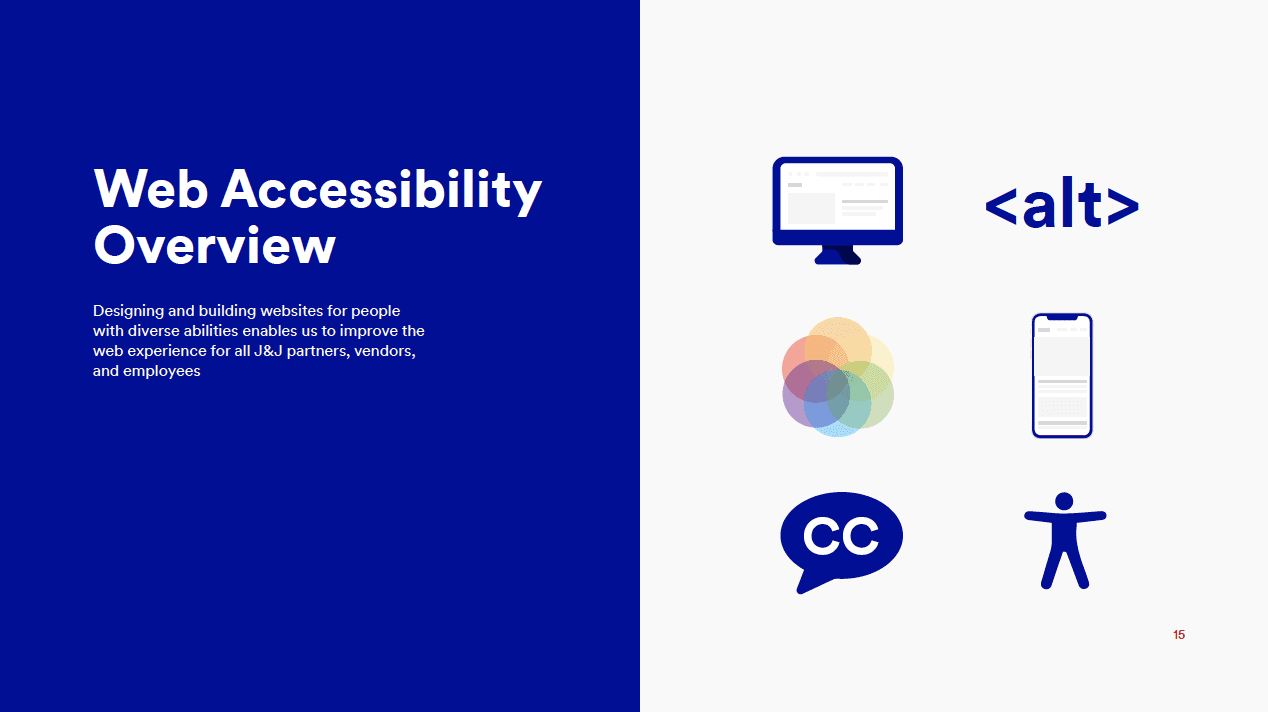 Give all J&J stakeholders a basic understanding of accessibility standards in UX, digital spaces, and everyday life.