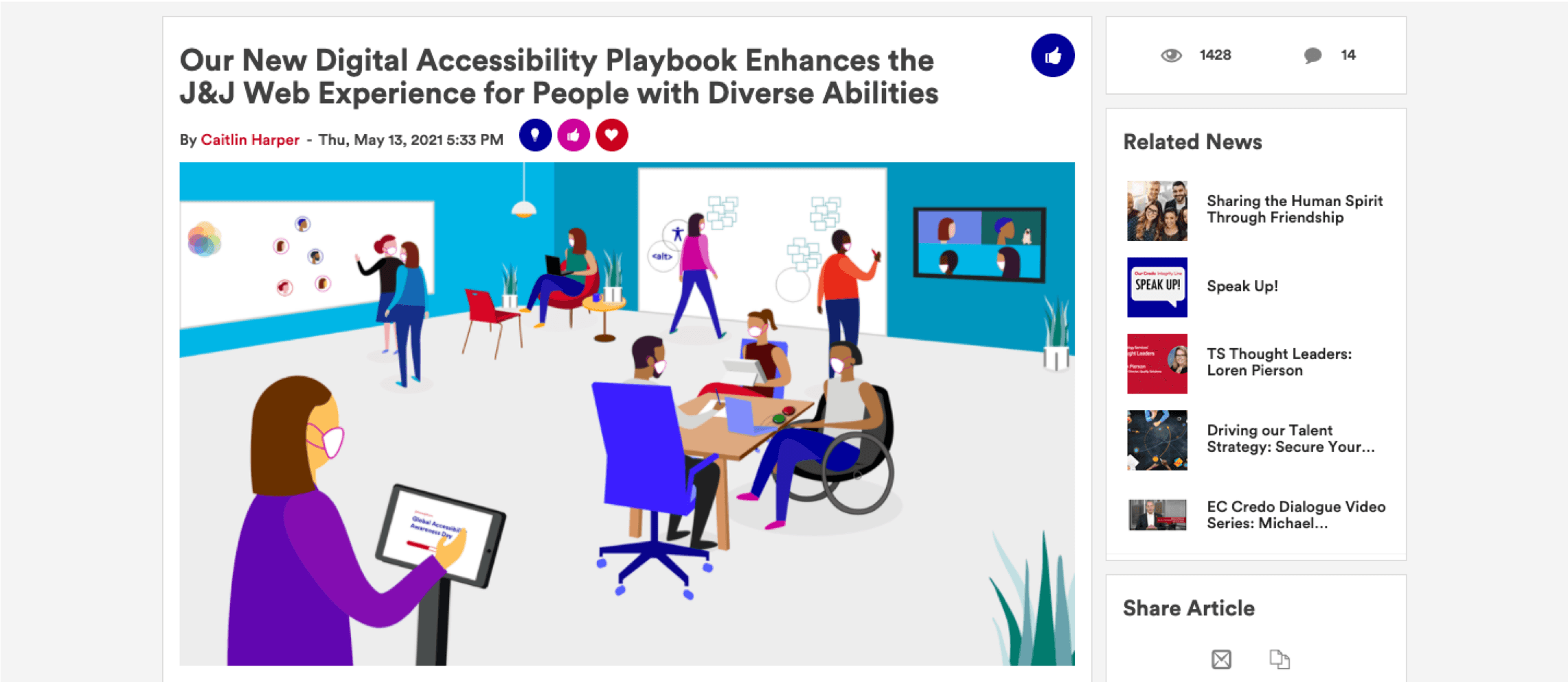 Over the course of a year, I led the creation of a comprehensive digital accessibility playbook at J&J. This playbook is more than just a guide; it's a catalyst for change, embedding the importance of digital accessibility into the fabric of our company culture. It equips employees across various departments with the knowledge and tools necessary for implementing inclusive design principles.