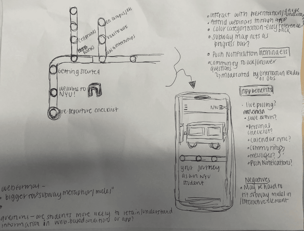 The app was intended to be a one-stop solution for these students, providing them with all the necessary information in an easily digestible format, thereby reducing cognitive overload and enhancing their overall orientation experience. The design process incorporated various stages, from initial concept development to interactive prototyping, ensuring alignment with NYU's brand identity and accessibility standards.